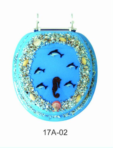 Trimmer decorative polyresin toilet seat with dolphins and coral in blue ocean.